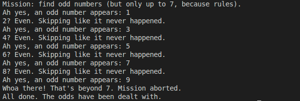 print("All done. The odds have been dealt with.")continue skips ahead, break exits the loop — sometimes you just need boundaries.
