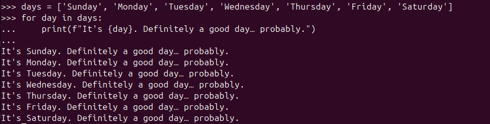 print(f"It's {day}. Definitely a good day… probably.")Looping through a list — no indexes, no headaches.