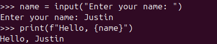 print(f"Hello, {name}")Python politely pauses and waits for the human to say something.