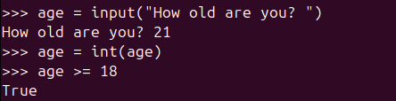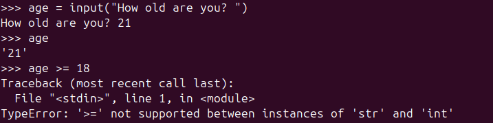 age >= 18User input is always a string — numbers included. Python is not fooled.