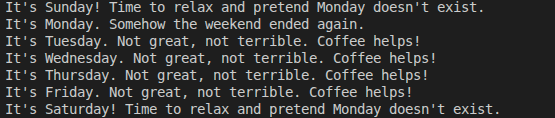 print(f"It's {day}. Not great, not terrible. Coffee helps!")Mixing for loops and if statements to make decisions per item.