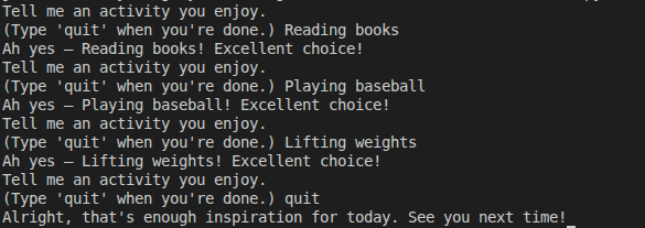 print("Alright, that's enough inspiration for today. See you next time!")This loop keeps running until the user explicitly types quit.