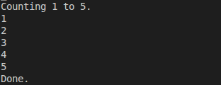 print("Done.")A simple while loop counting from 1 to 5 — one step at a time.