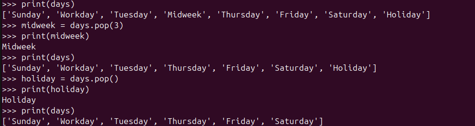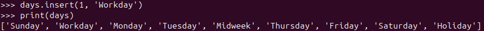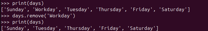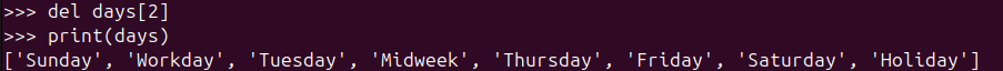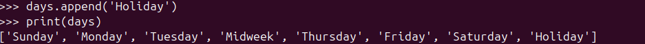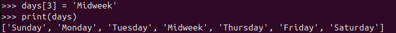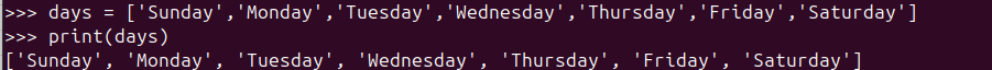 days = ['Sunday','Monday','Tuesday','Wednesday','Thursday','Friday','Saturday']When we print this list, Python shows all the elements inside square brackets: