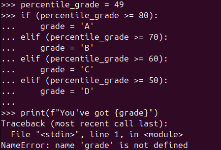 In this example, when Python hits elif percentage_grade >= 60, 'C' is assigned to grade, and it never checks the conditions for 'D' or 'F'.