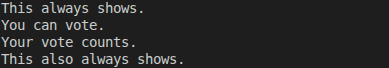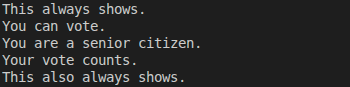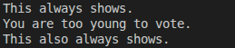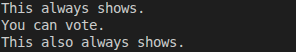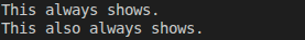 print("This also always shows.")The condition is False, so Python skips the indented block and continues with the next line.